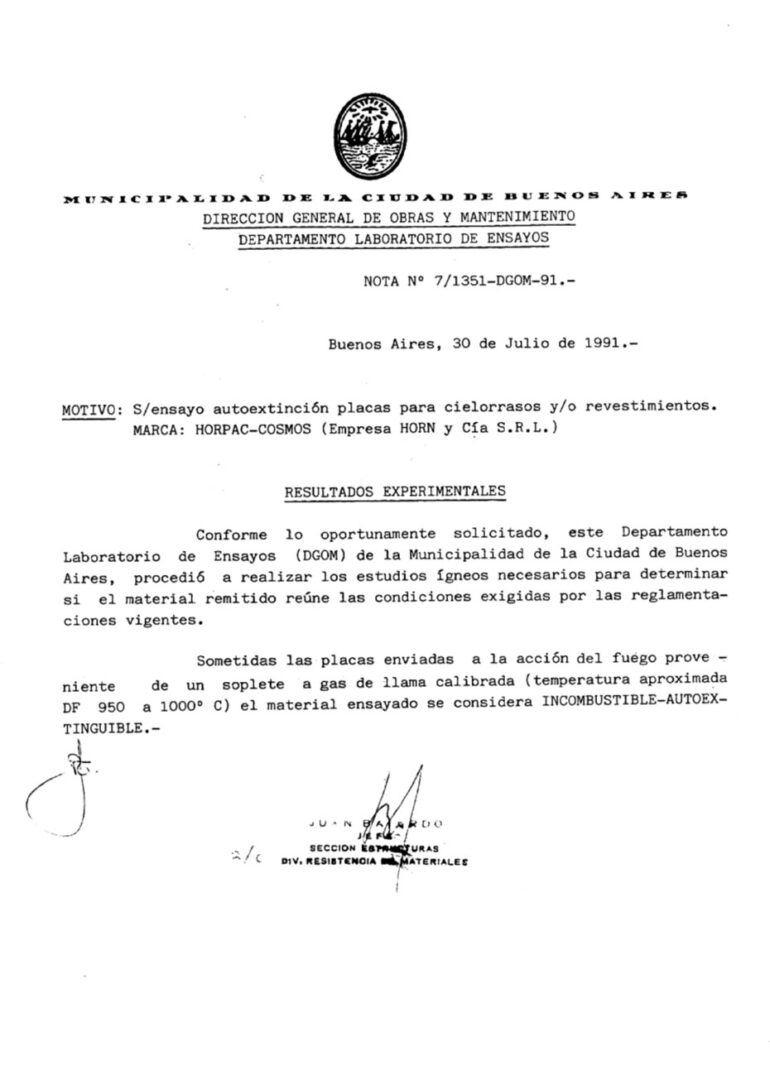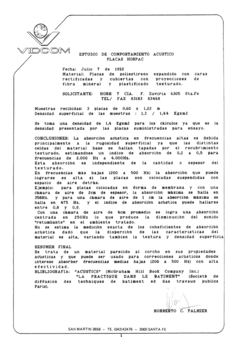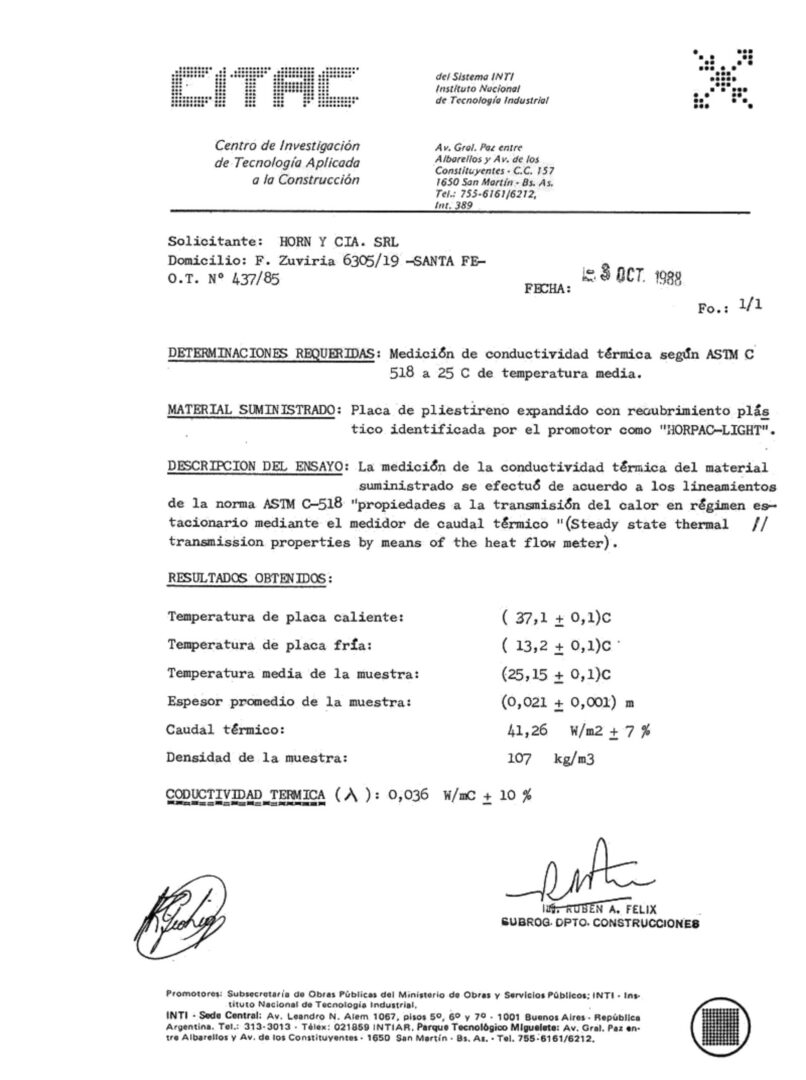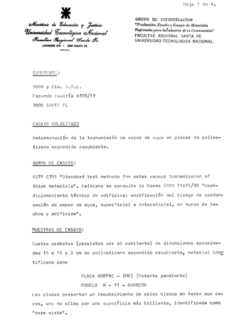 En el caso de la placa HORPAC, el poliestireno expandido calidad «F», clasificación B1. Origen: Municipalidad de Buenos Aires, Dirección General de Obras y Mantenimiento, Departamento Laboratorio de Ensayos, División Resistencia de Materiales. Ensayo del 30 de julio de 1991 firmado por Juan Bazán.